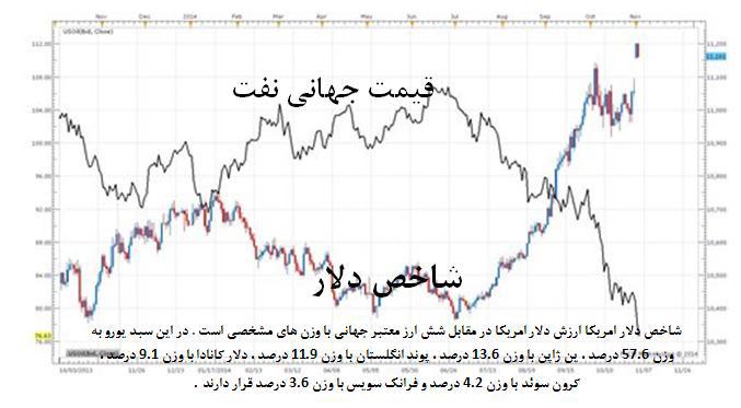 نمودار بالا نشانگر اینه که در یک دهه گذشته رابطه قیمت نفت با شاخص دلار آمریکا معکوس بوده و هر وقت دلار آمریکا تقویت شده قیمت جهانی نفت کم شده. این کاهش قیمت برای همه کالاهای اصلی اتفاق افتاده و کشورهای کالا پایه همه دچار رکود هستند مانند: