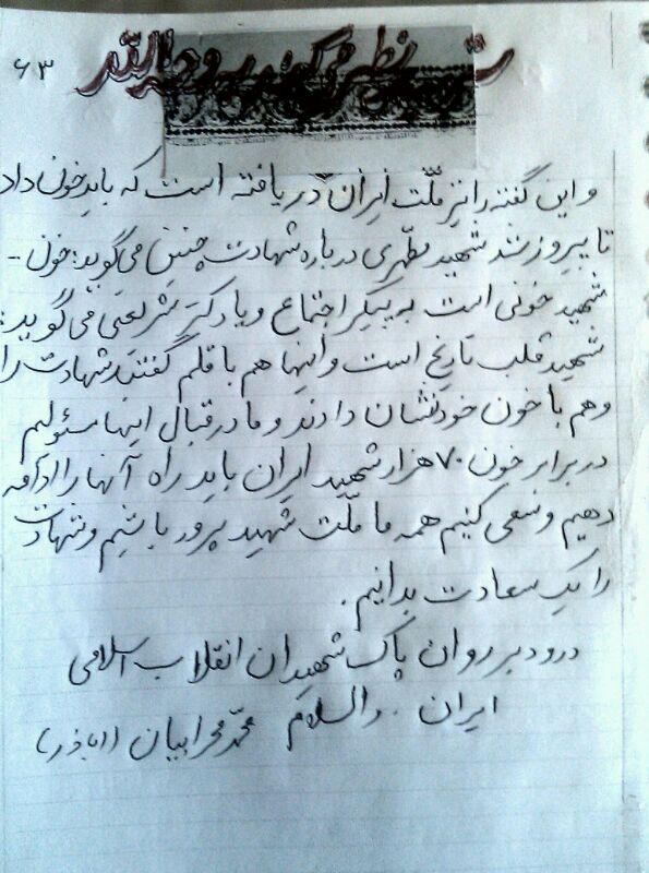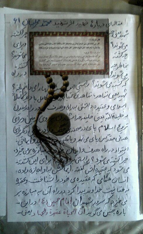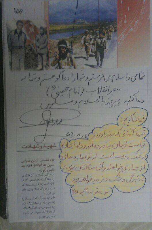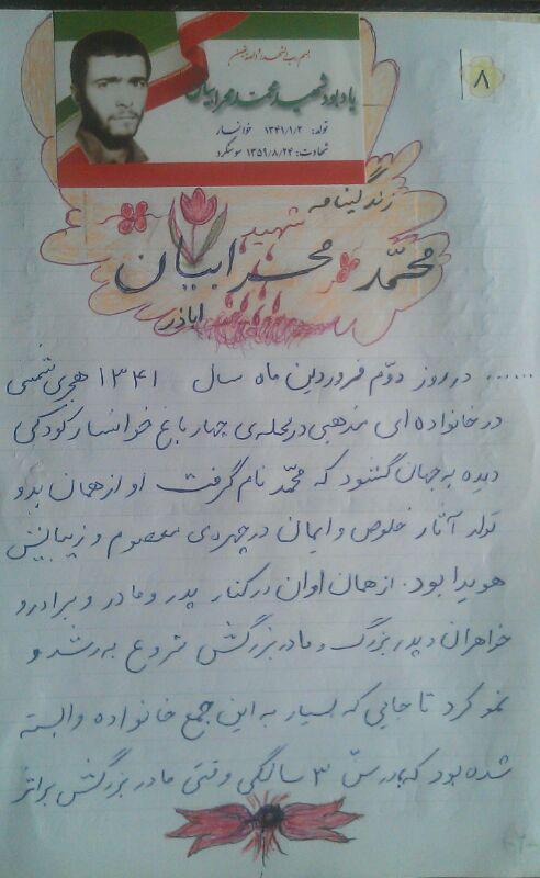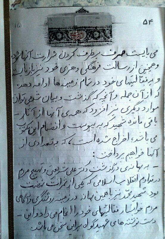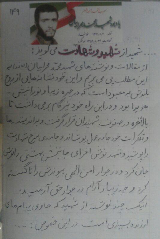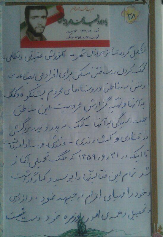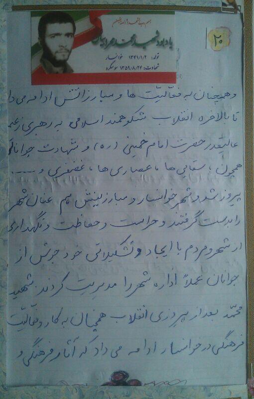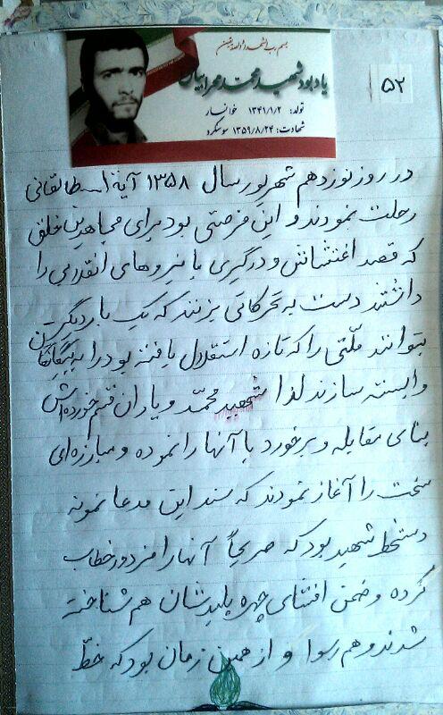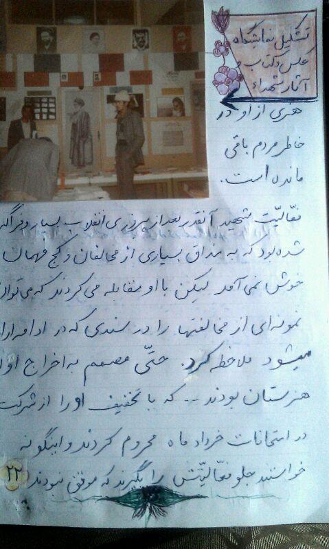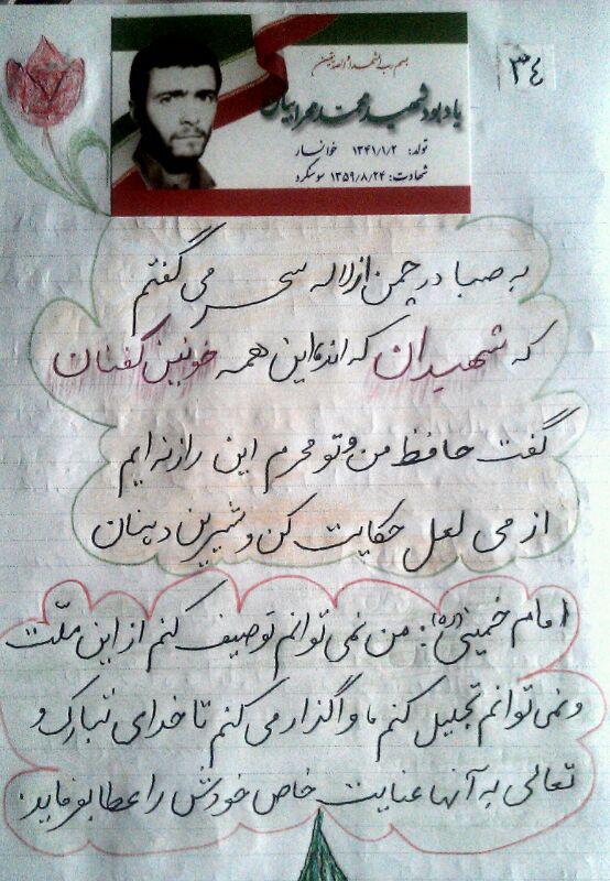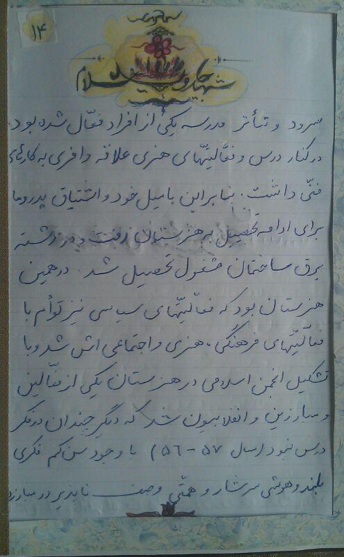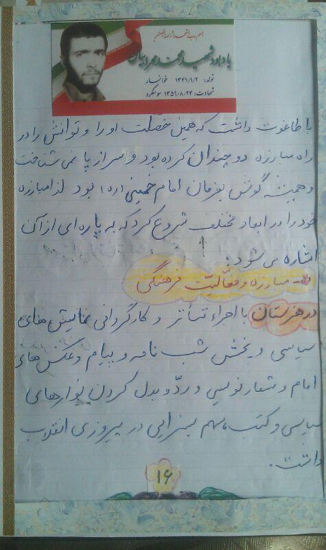 یادنامه ای که از خانواده این شهید والا مقام دریافت شد (۱۷۱صفحه): از بخش های جذاب این ویژه نامه فعالیتهای فرهنگی-هنری این شهید از جمله آرم هایی که طراحی کرده و نمایشنامه های تاترهایی است که نگاشته است. همچنین مکتوب زیبایی که از مرحوم آیت الله طالقانی مرقوم نموده و مبارزاتی که با تفکرات مارکسیستی و التقاطی داشته و یک بخش بسیار جذاب از مصاحبه با مردم روستاهای محروم اطراف خوانسار و تهیه گزارش از آنها.