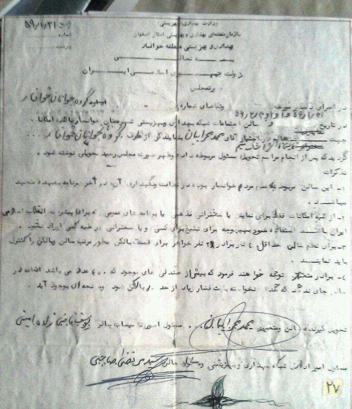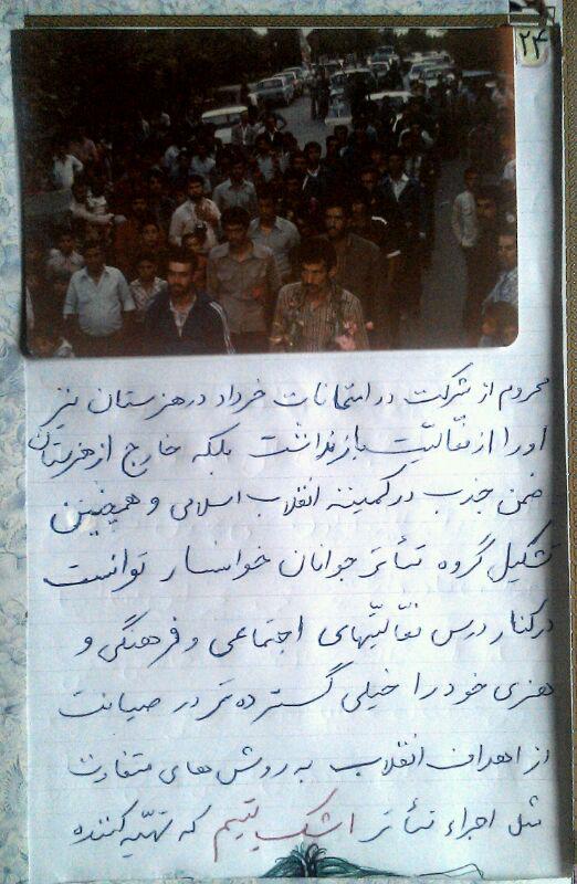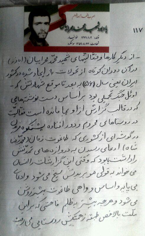 توضیحات جانباز گرانقدر آقای عزیز: اولین شهید بسیجی خوانسار محمد محرابیان در مهر ماه سال۱۳۵۹ به اتفاق سید اکبر صادقی به جبهه جنوب رفتند و در اواخر آبان ۱۳۵۹ در آزادسازی سوسنگرد به شهادت رسید. در عملیات آزاد سازی سوسنگرد سید اکبر صادقی مجروح شد.