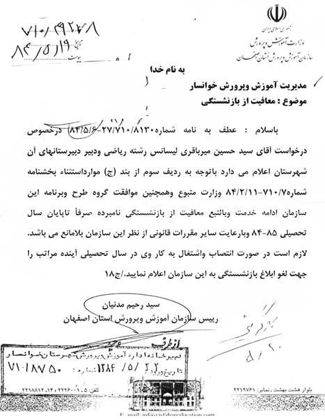 عصر روز ۲۴/۶/۱۳۸۴ بود که اطلاع یافتم، آموزش و پرورش خوانسار، علیرغم موافقت رسمی و مکتوب اداره کل آموزش و پرورش اصفهان برای ادامة خدمتم، بر بازنشسته کردن من اصرار دارد و نعمت تدریس سرکلاس را از من سلب کردند. برای اینکه ببینید چه دردی کشیده ام، دو سند را تقدیمتان میدارم: